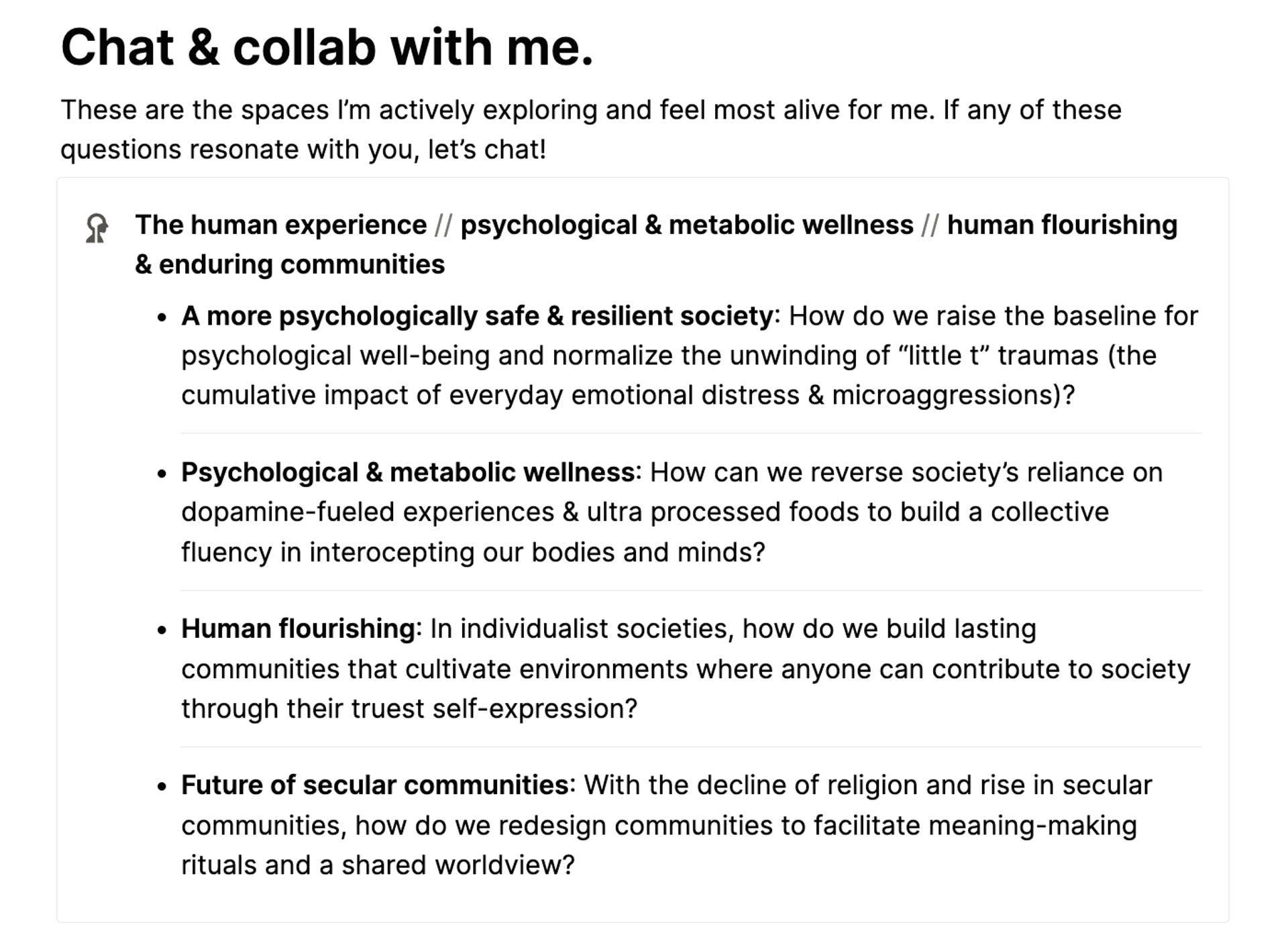 For example: I knew I wanted to spend my time thinking about psychological wellness and human flourishing. If an opportunity to chat about enterprise tech (a focus of mine in a prior life) surfaced, I could confidently pass knowing that I was freeing up space to focus on the most energizing conversations.
